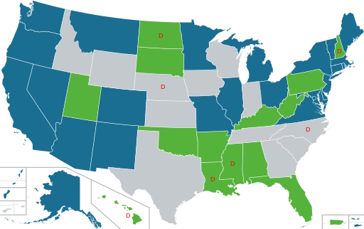 More than two-thirds of the U.S. legalized some form of pot use in 2023. The Blue states have legalized recreational use of pot. The green states have legalized pot for medical purposes, and the states marked with a letter D have decriminalized its use as well.